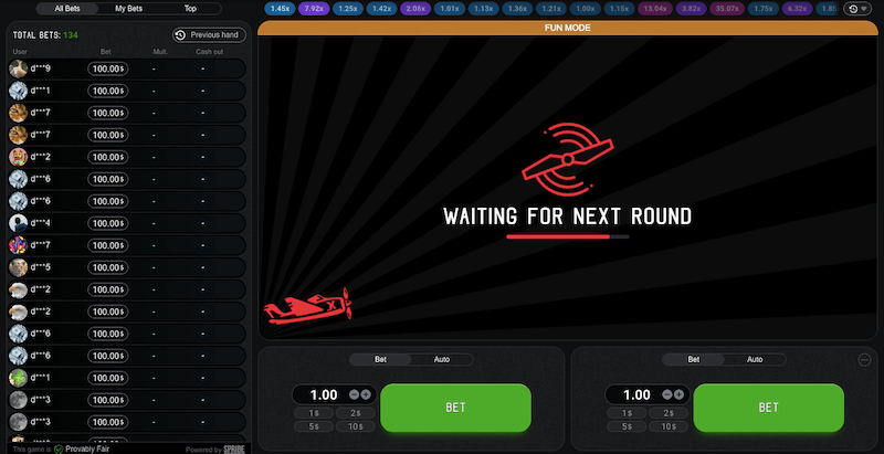 The green ‘Bet’ button turns into ‘Cash-Out’ after the plane takes off. You can grab your winnings at any time by clicking on it. Overall, the controls seem simple and straightforward, so beginners will quickly master them.