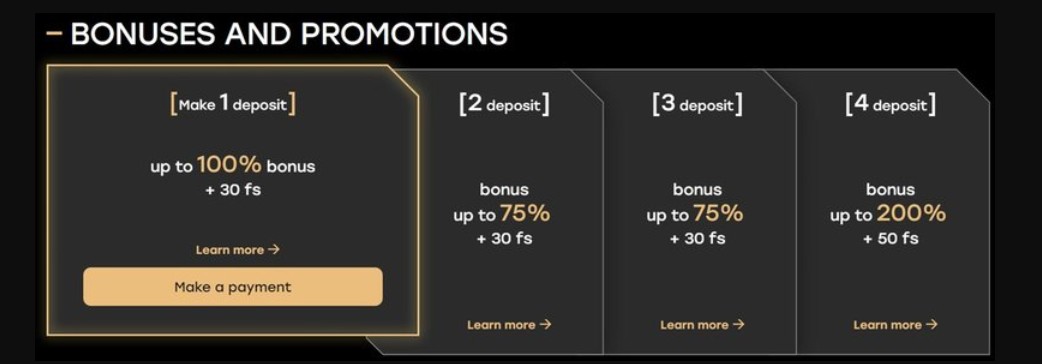 Depending on your first deposit amount (20+ USDT, 250+ USDT, or 500+ USDT) you will receive a 50%, 75%, or 100% match bonus. Its max value varies from 125 USDT to 100,000 USDT. The casino will also add 10, 20, or 30 free spins available on the most popular crypto video slots. And while bonuses vary, they all come with a 60x wagering and a 72-hour expiration date.