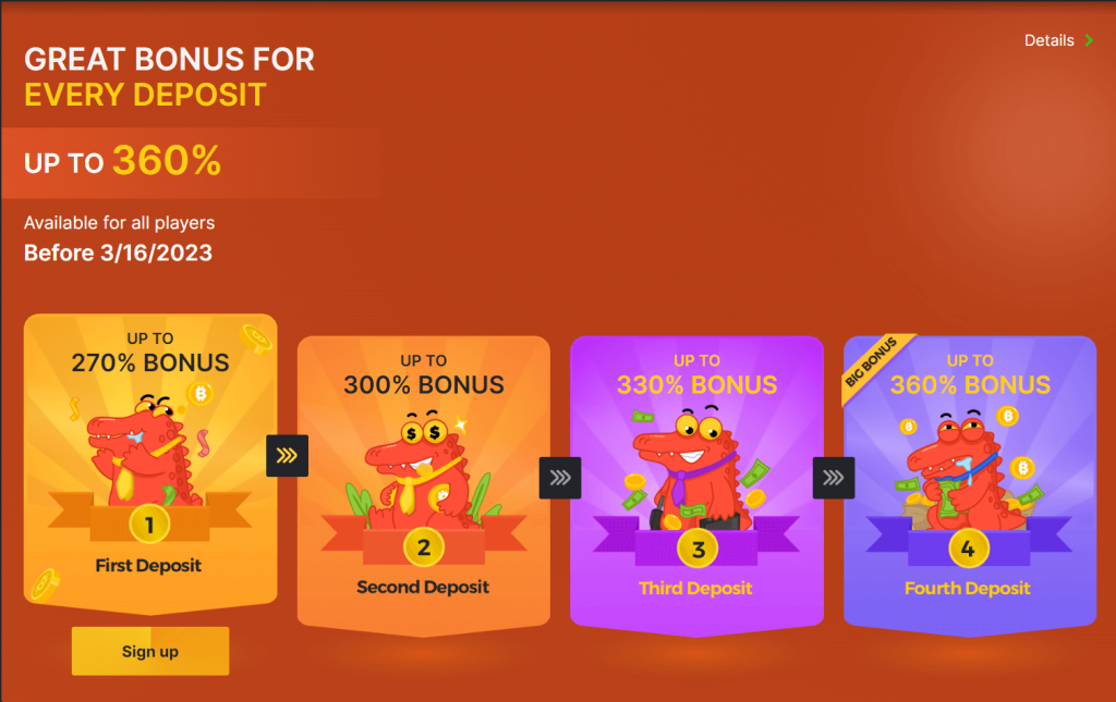 The third deposit brings from 100% to 220% for a deposit of $120-$1,500. You can get up to $3,300.