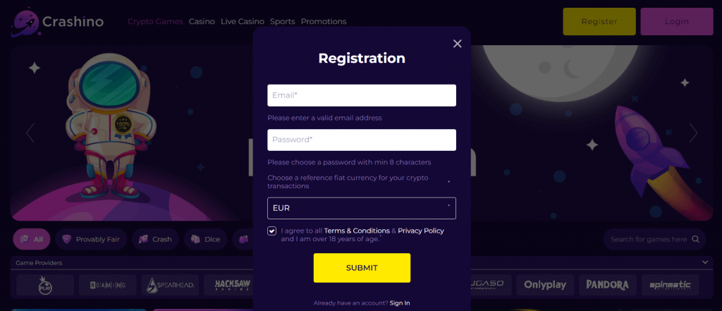 Navigate to Crashino's official website and click the "Register" button.
